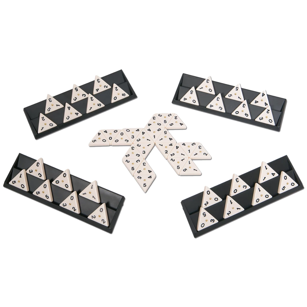 Het originele Triominos spel! Zoek je kansen, leg ze snel aan en scoor zo veel mogelijk punten. Bij dit spel gaat het niet alleen om inzicht maar ook om tactisch spelen: sommige aangelegde figuren leveren je namelijk ook veel punten op! Het spel begint door een willekeurige steen op tafel te leggen en de speler scoort ook de waarde van deze steen. Iedere speler probeert tijdens zijn beurt één van zijn Triominos stenen passend aan te leggen aan alle kanten van alle stenen die reeds op tafel liggen. Het spel eindigt wanneer een speler alle stenen van zijn plankje heeft gespeeld. De winnaar is uiteindelijk degene met de meeste punten. Inhoud: 56 stenen, 4 plankjes en spelregels. Voor 2 tot 4 spelers vanaf 6 jaar.